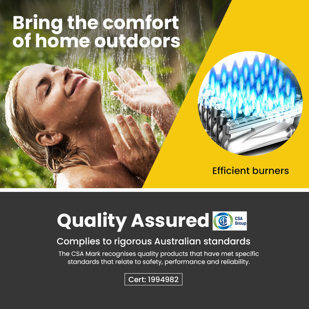 Operation is also a breeze thanks to a seasonal control setting, and automatic ignition which ignites the burner as soon as water flows. You can even select a desired flow setting on the premium shower head, ranging from a light rainfall up to an invigorated massage like pressure! When water flow is switched off at the trigger head, the unit automatically shuts down.