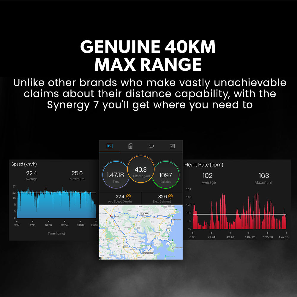 Battery technology quality varies significantly between brands of e-scooters. At the heart of the Synergy 7 MKII is its huge premium-grade 37V 15Ah battery, which offers an impressive genuine range of up to 40km and an excellent cycle life!